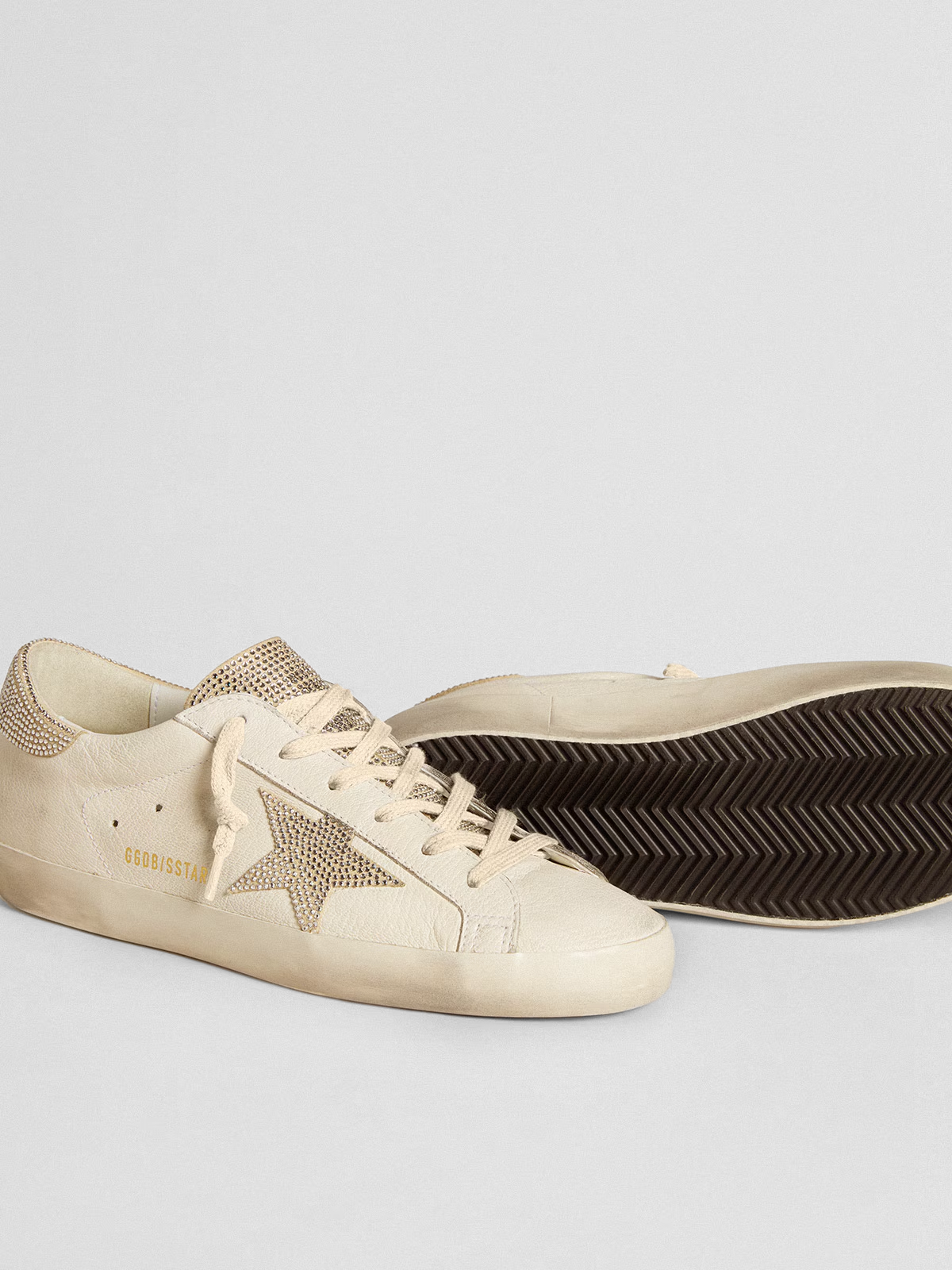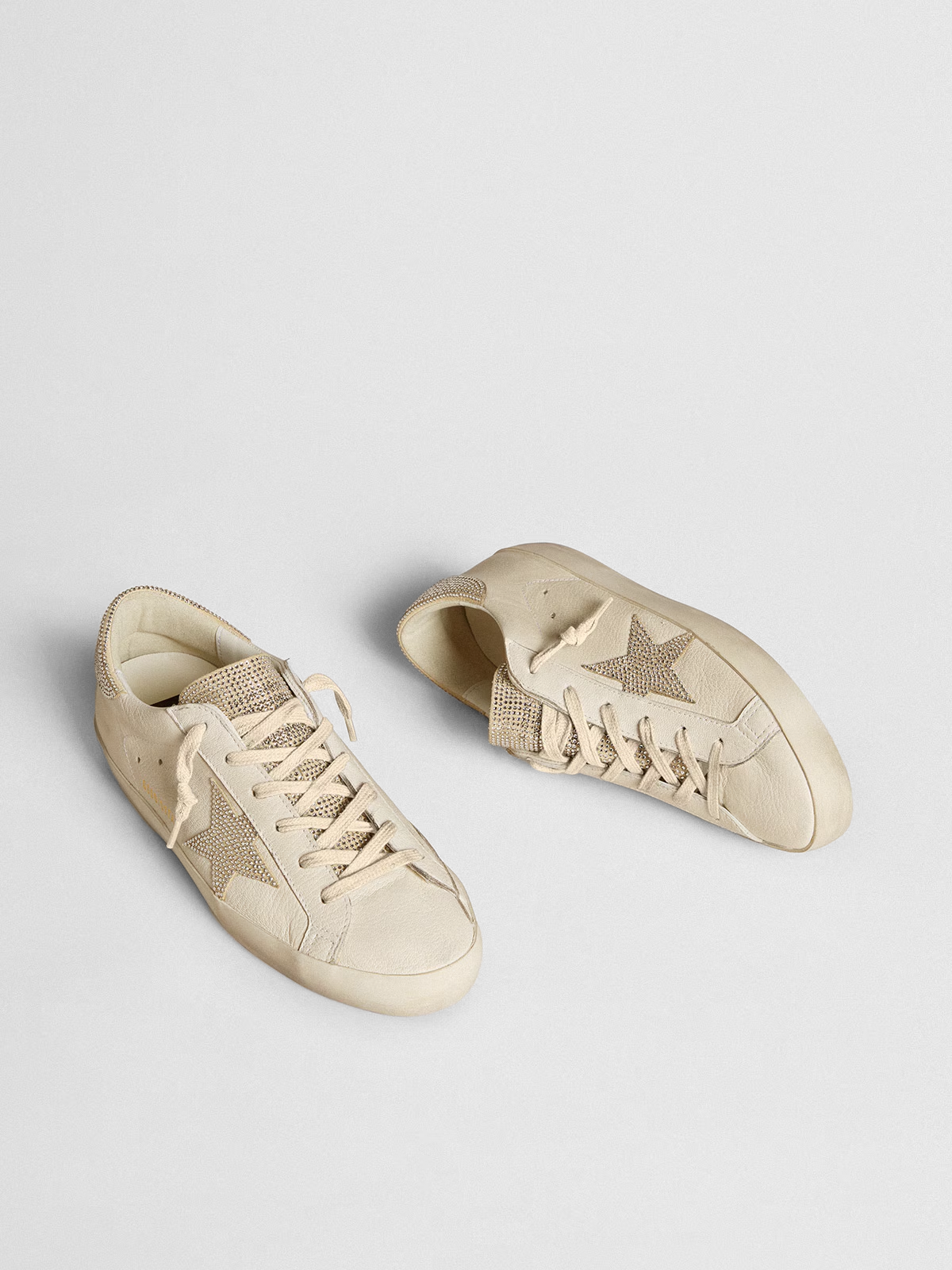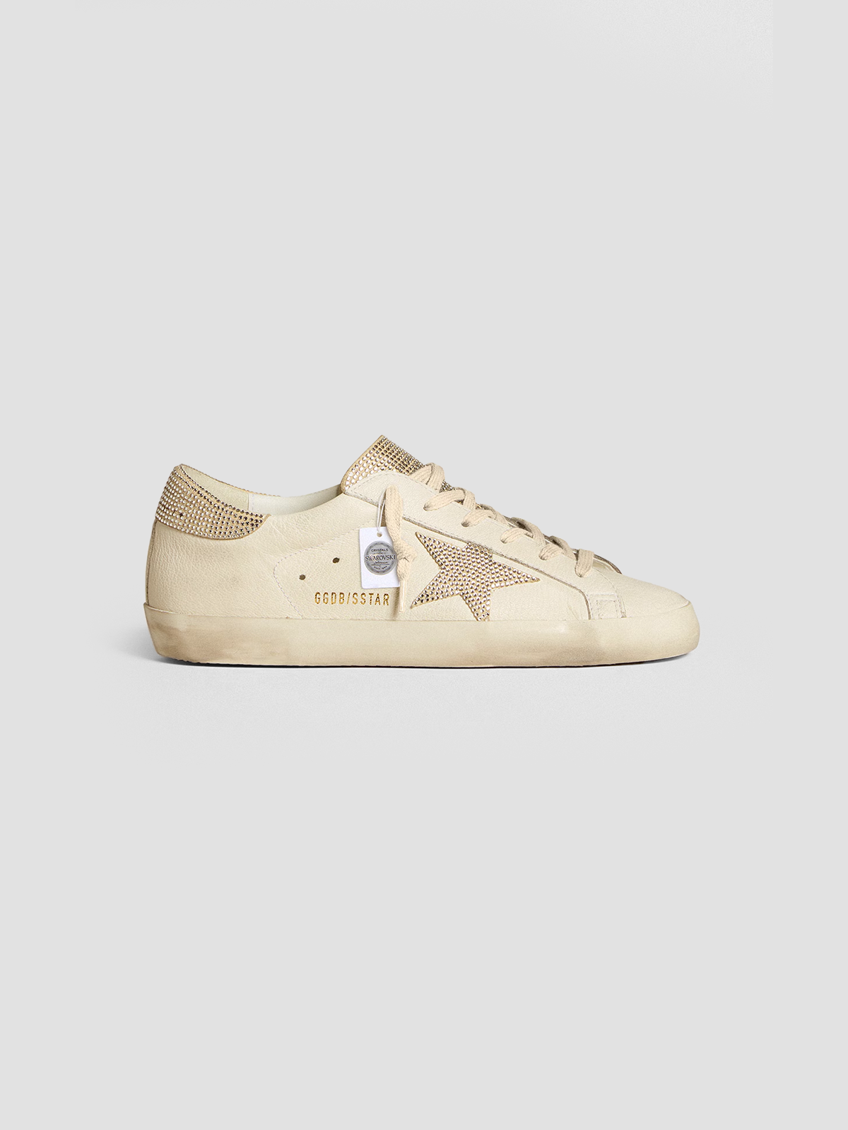 A timeless icon yet one that’s constantly evolving. At Golden, we love taking our classics and reworking them all the time, always from a new angle. These Super-Star with a white nappa leather upper feature a beige suede star and heel illuminated by tone-on-tone Swarovski crystals. The beige suede tongue and beige laces add the finishing touch.